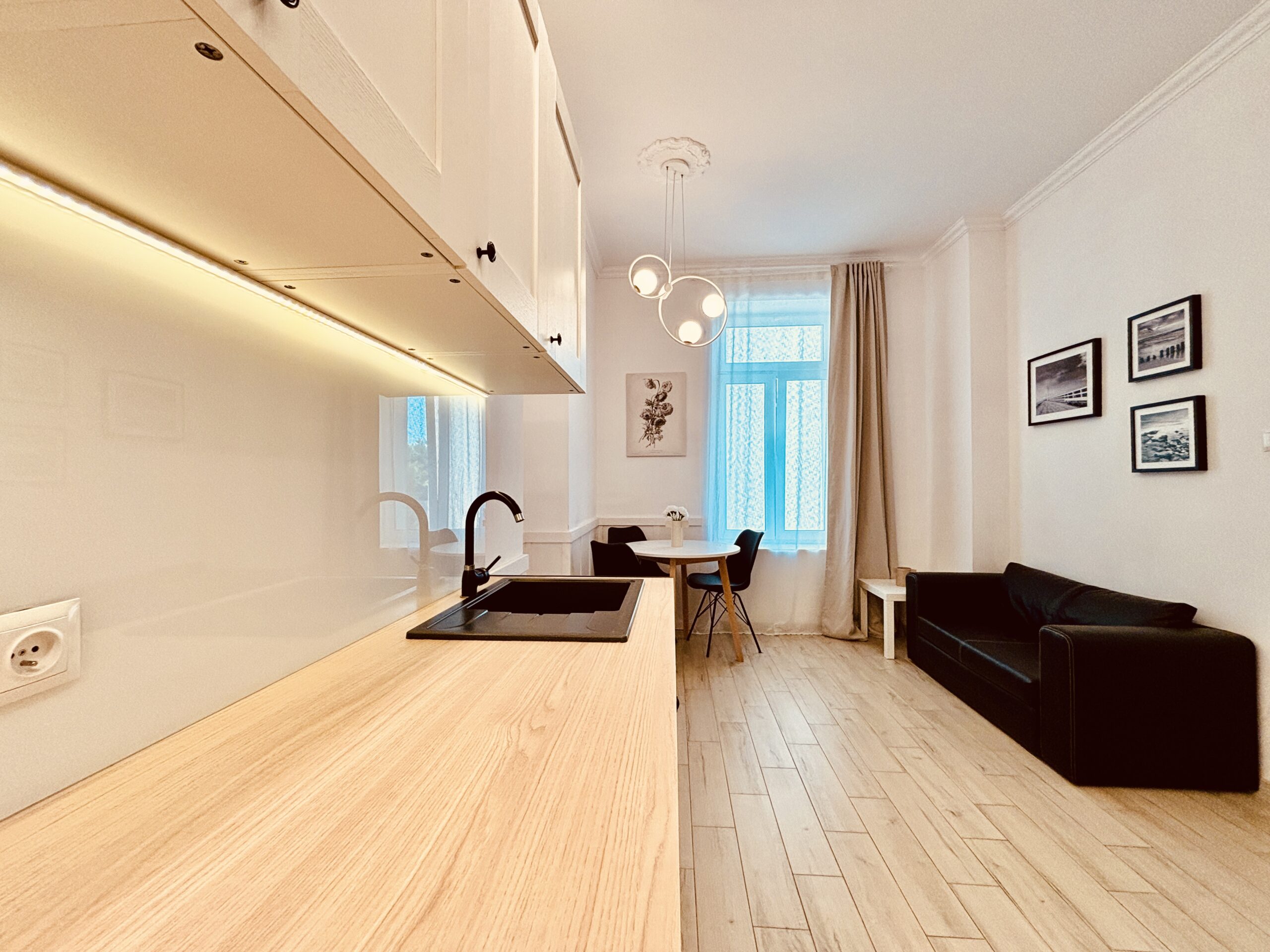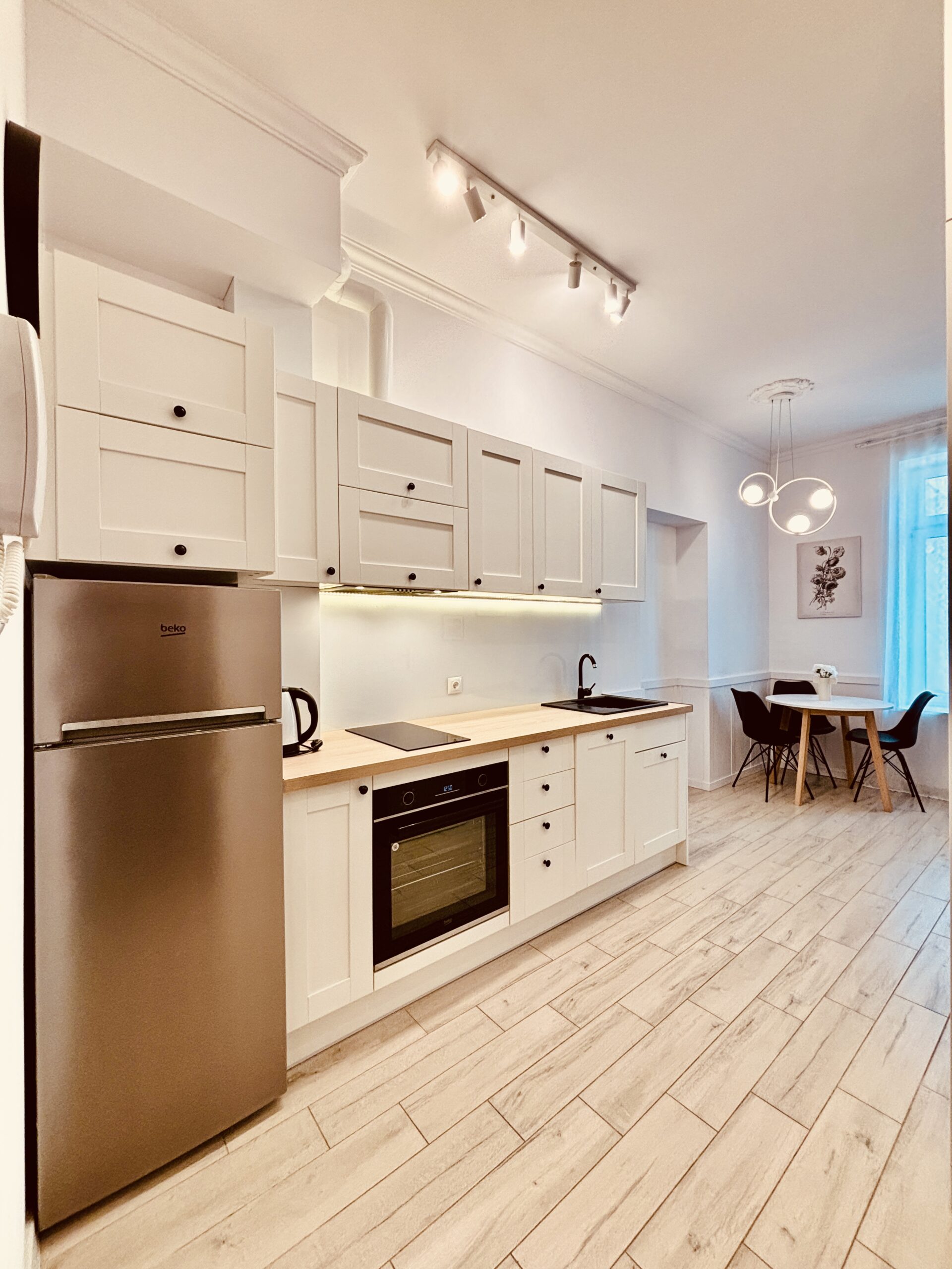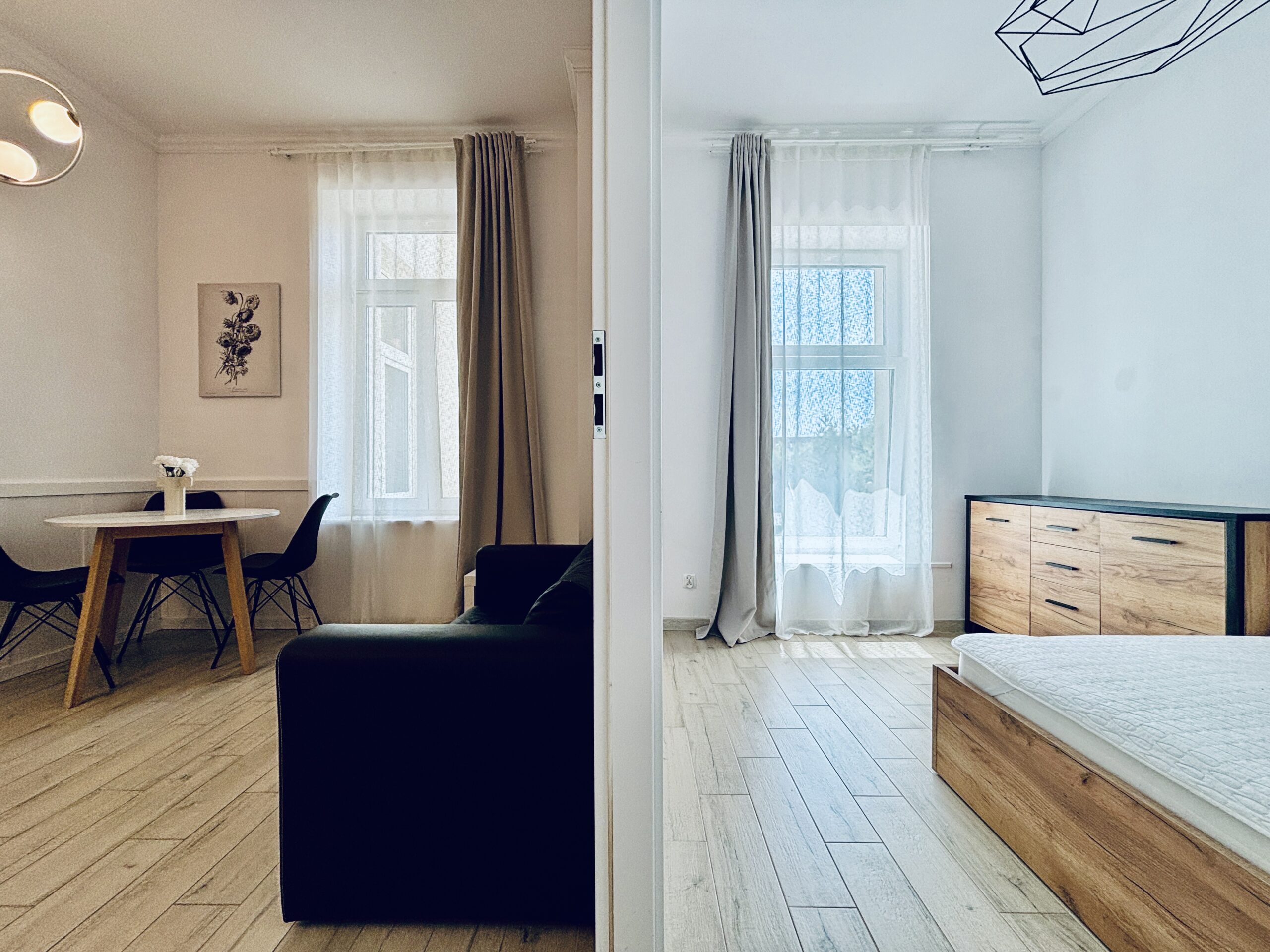 Apartament ma 28 m². Został zaprojektowany z myślą o wygodzie gości. Do dyspozycji jest dobrze wyposażona kuchnia z niezbędnymi akcesoriami oraz sprzętem AGD, połączona z małym salonem, w którym znajduje się mała sofa, telewizor 40 cali oraz stół z krzesłami. Apartament oferuje także osobną sypialnię z wygodnym łóżkiem 140×200, łazienkę z prysznicem oraz pralkę.